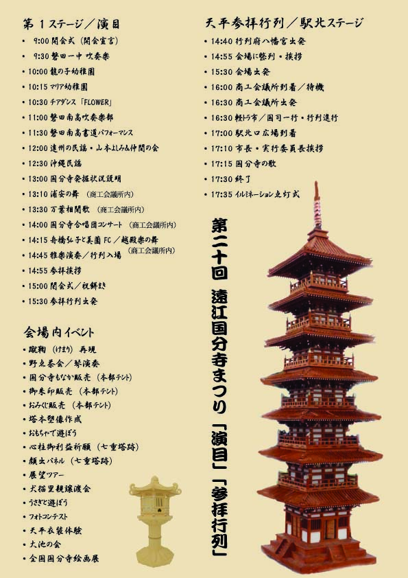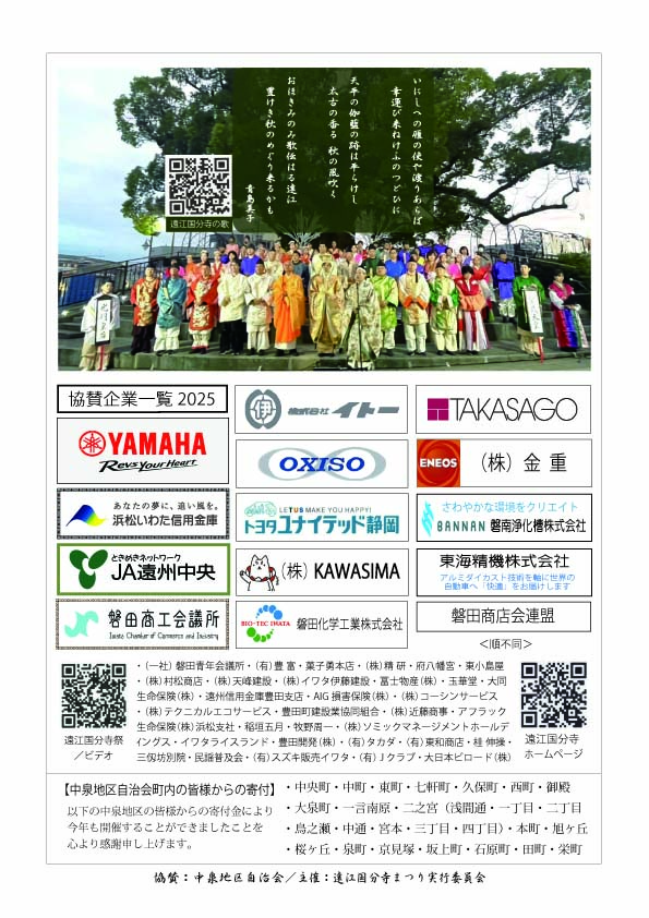 国分寺まつり開催に当たり、皆様には日頃から大変お世話になっています。実行委員会と致しましても、「磐田の歴史文化」の啓蒙活動として、地域の皆様と共に大切に守ってゆきたいという思いで、『国分寺まつり
